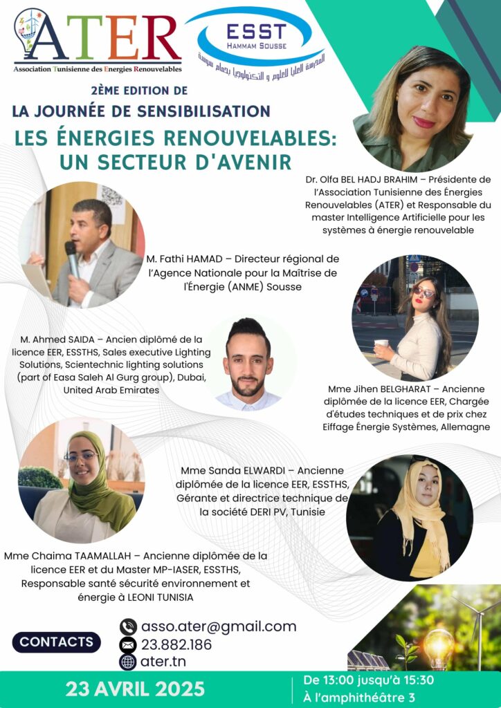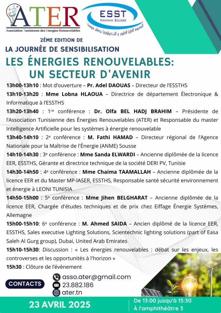 C’est pour répondre à cette interrogation avec authenticité, pragmatisme et vision que l’Association Tunisienne des Énergies Renouvelables (ATER), en partenariat avec l’École Supérieure des Sciences et de la Technologie de Hammam Sousse (ESSTHS), organise le 23 avril 2025, de 13h à 15h30, une Journée de Sensibilisation intitulée : « Les Énergies Renouvelables : Un Secteur d’Avenir ».